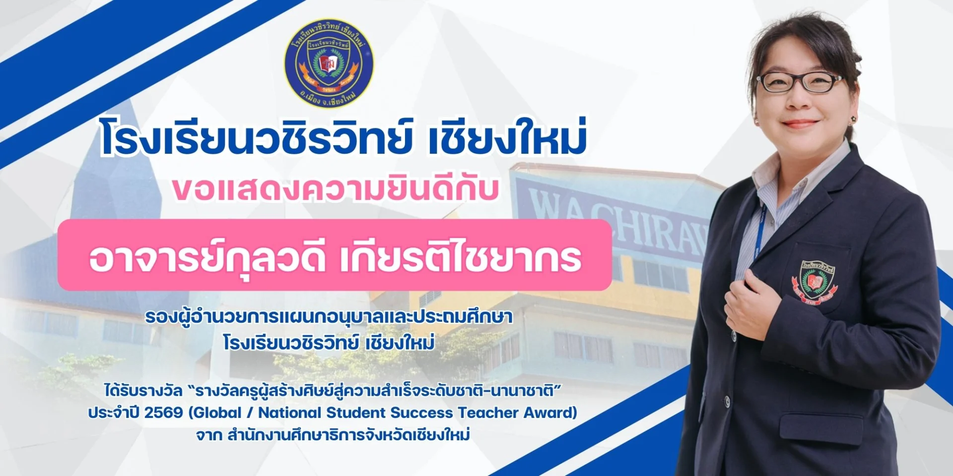 1.Ms. Kunwadee Kietchaiyakorn, Deputy Director of the Kindergarten–Primary Department, Wachirawit Chiang Mai School, received the “Global / National Student Success Teacher Award” for the year 2026, presented by the Chiang Mai Provincial Education Office.