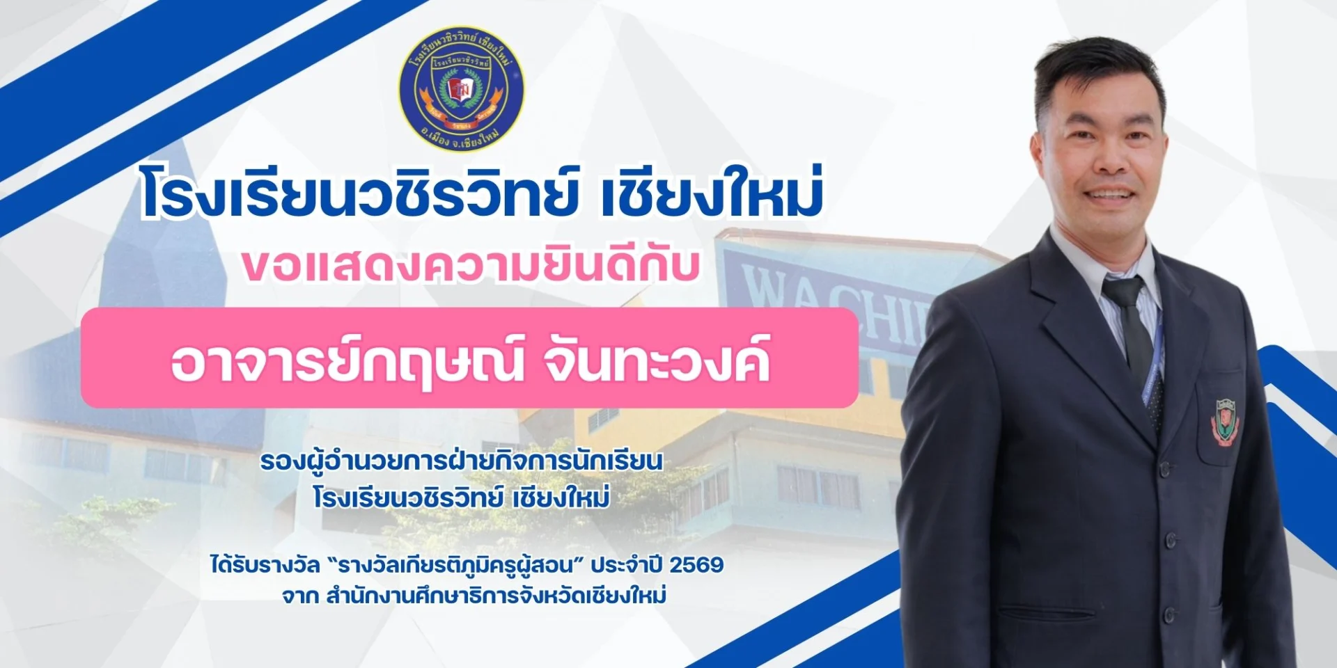 2. นายกฤษณ์ จันทะวงค์ รองผู้อำนวยการฝ่ายกิจการนักเรียน โรงเรียนวชิรวิทย์ เชียงใหม่ ที่ได้รับรางวัล “รางวัลเกียรติภูมิครูผู้สอน” ประจำปี 2569 จาก สำนักงานศึกษาธิการจังหวัดเชียงใหม่